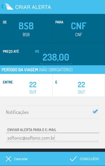 No entanto, o diferencial dele é criar alertas de preços para voos. Marque a origem e destino do voo, quanto você quer pagar e forneça um endereço de e-mail. Se algum bilhete ficar abaixo da faixa do valor normal, o Voopter garante que você vai saber.